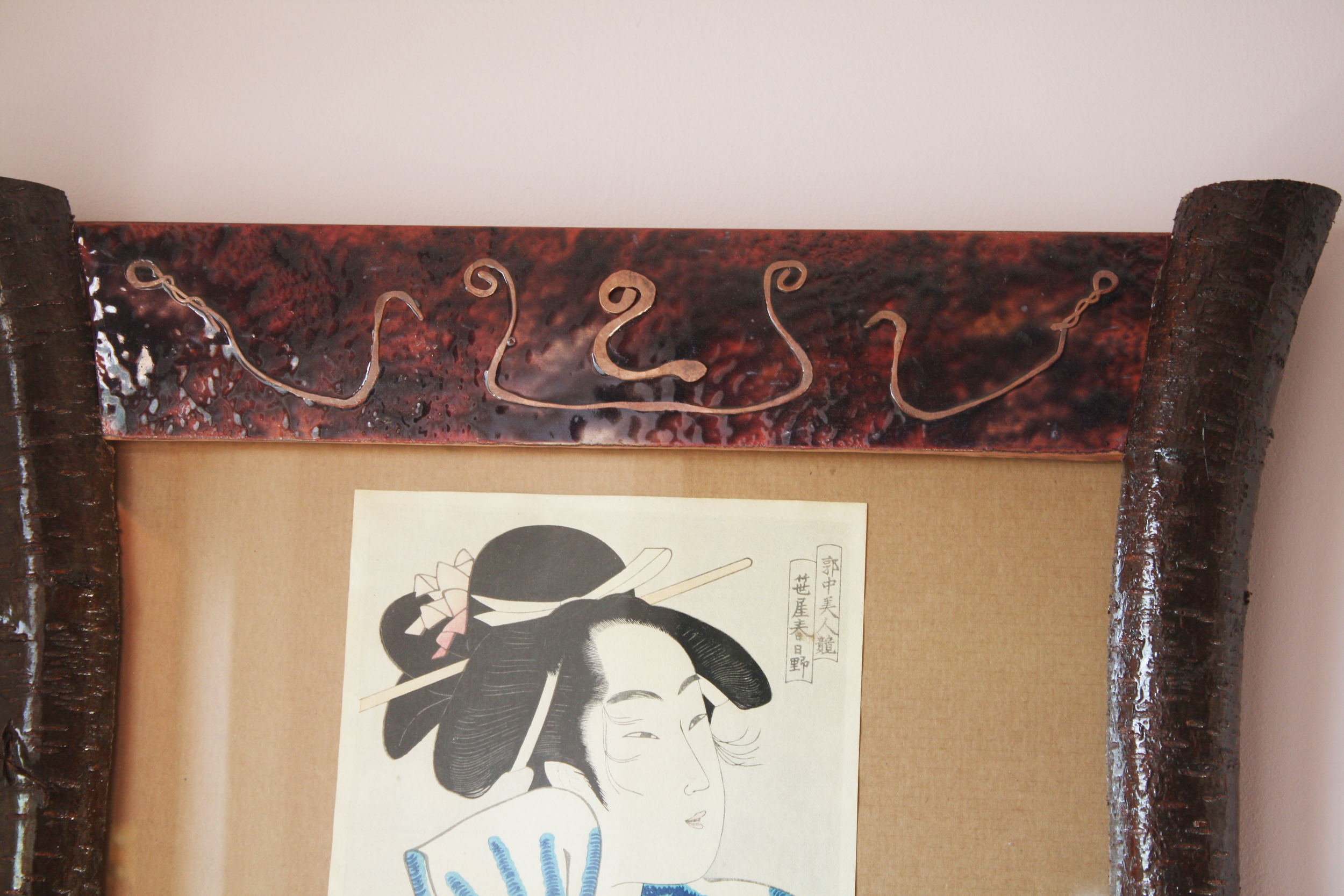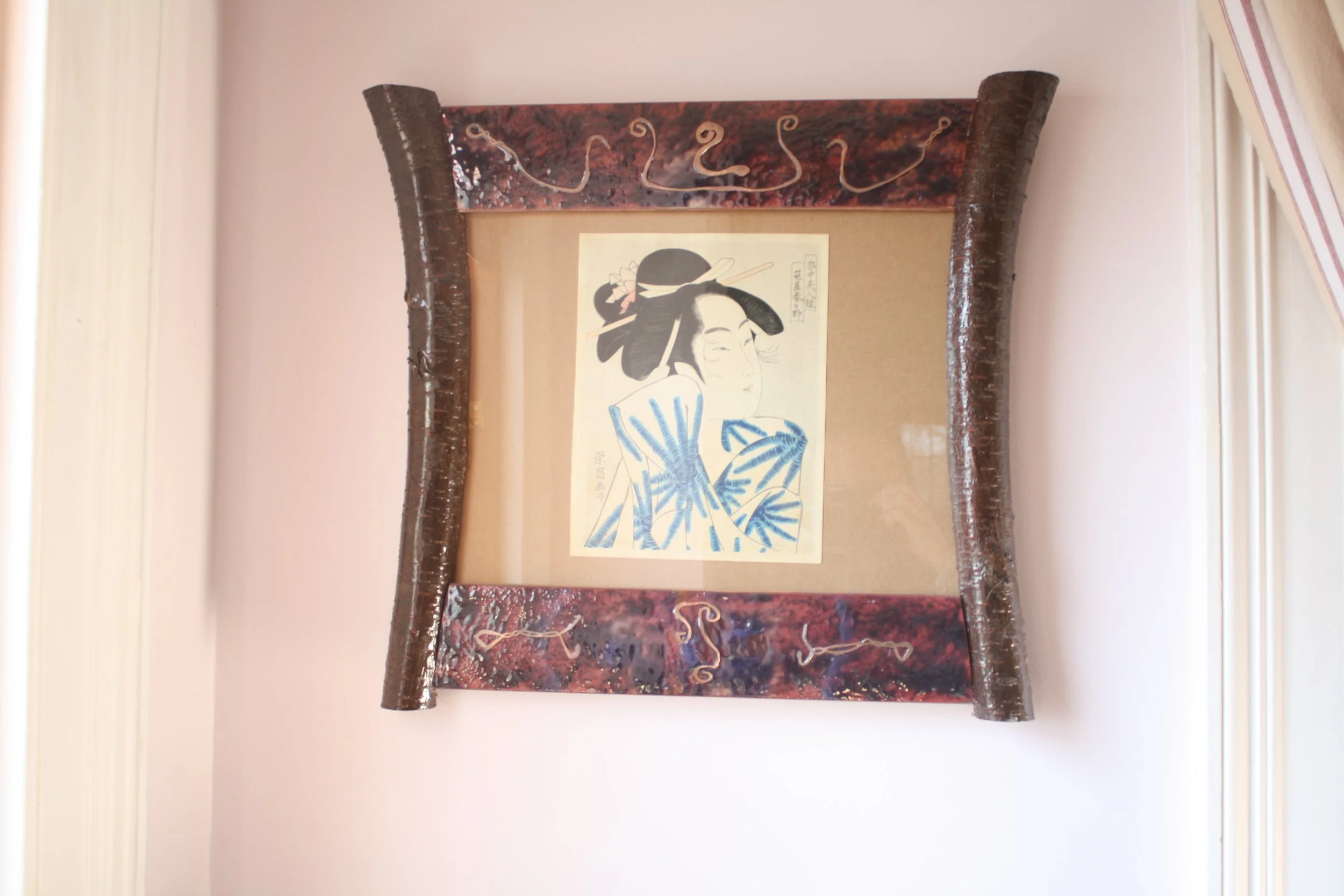 Enamel Glass on copper, Cherrywood branch with hammered copper.